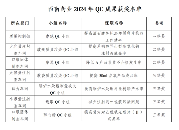 為深入學(xué)習(xí)貫徹黨的二十大精神和習(xí)近平總書記關(guān)于質(zhì)量提升重要論述精神,推動質(zhì)量強國建設(shè),進一步激發(fā)員工參與質(zhì)量改進的積極性,提高全員質(zhì)量意識。近日,西南藥業(yè)2024年QC成果發(fā)表會在公司第三會議室隆重舉行。公司常務(wù)副總經(jīng)理蔣猛和副總經(jīng)理黃世瓊出席會議并擔(dān)任評委,各部室、車間負責(zé)人、QC小組活動相關(guān)人員、質(zhì)量管理人員、班組長及QC小組活動積極分子等近100人參加會議。