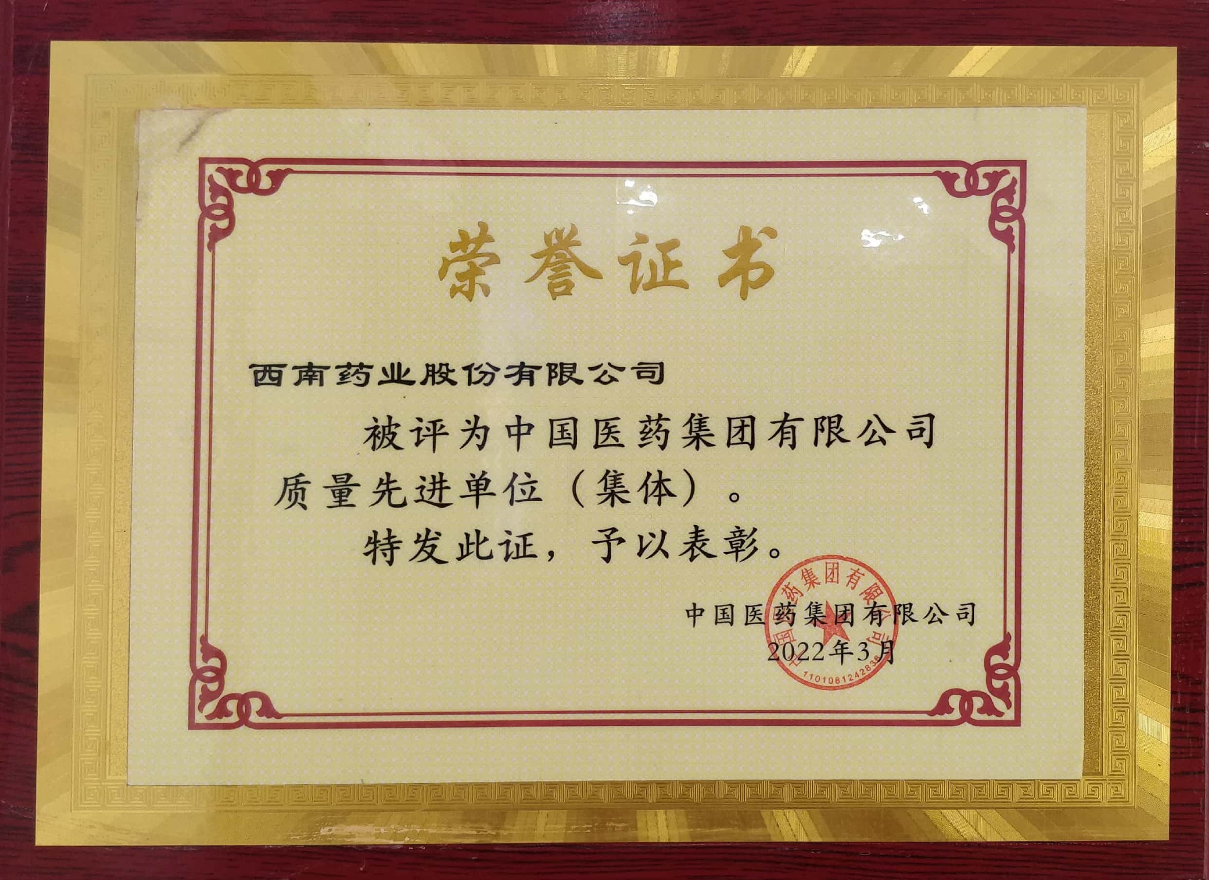 2022年3月,公司被評為中國醫(yī)藥集團有限公司質(zhì)量先進單位(集體)