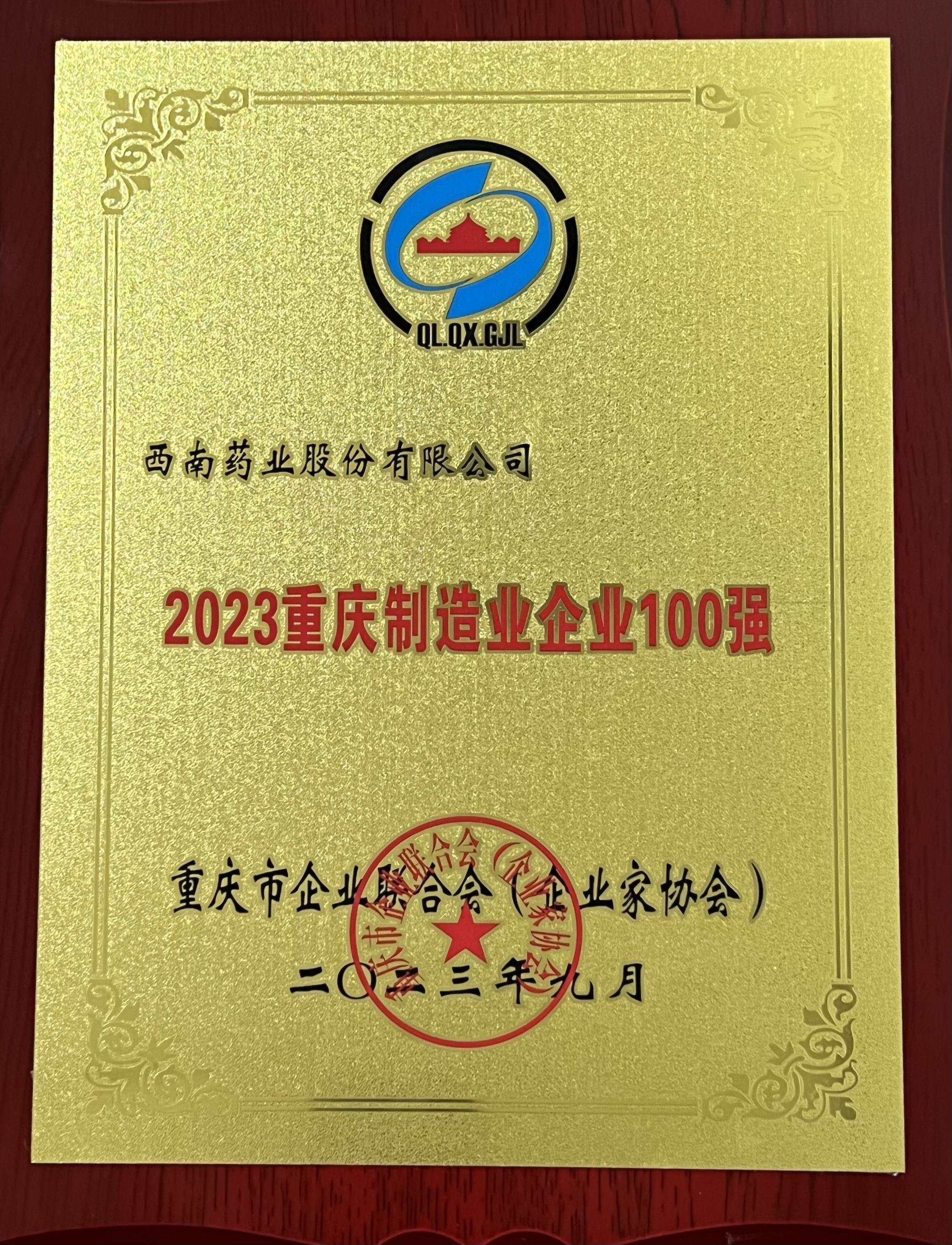 2023年9月重慶市企業(yè)聯(lián)合會(huì)(企業(yè)家協(xié)會(huì))頒發(fā)的2023重慶制業(yè)企業(yè)100強(qiáng)